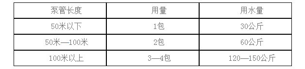使用方法:可根據(jù)混凝土輸送設(shè)備的類型和輸送泵管的長度,參考下表用量進行配置溶液。將本品倒入相應(yīng)體積的水中,攪拌2-4分鐘,使其充分溶解,當溶液變的粘稠潤滑后即可使用。